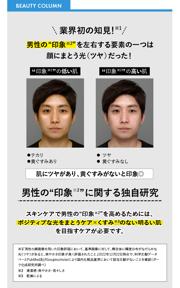 「男の肌なんて洗えば十分でしょ」と思っているパパさん、実は大間違いなんですって。オルビスの研究によると、男性の印象を左右するのは、肌に宿る「ポジティブな光(ツヤ)」なんだとか。