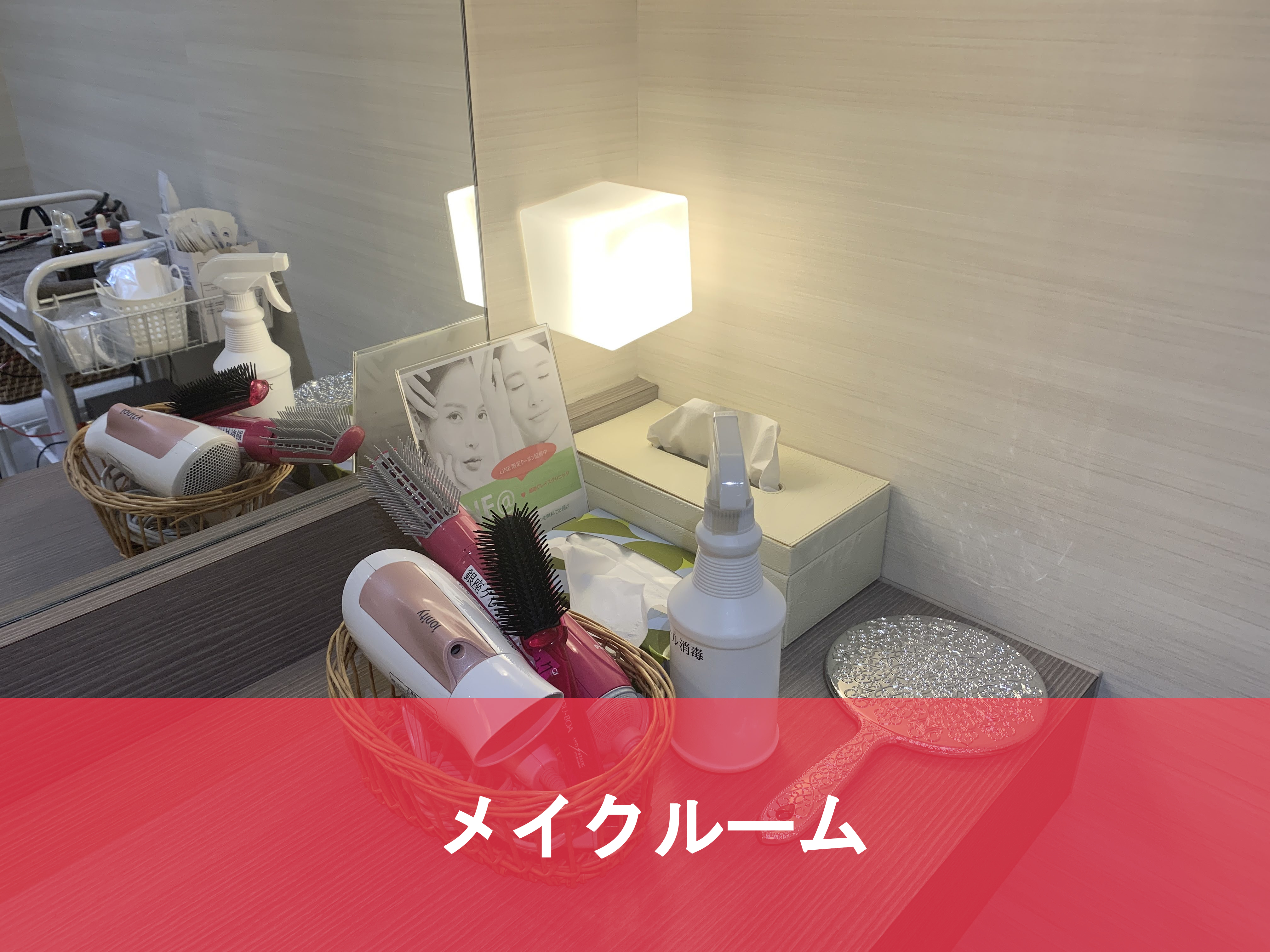 施術後のメイク直しもこちらで行います。ケミカルピーリングする際は、前髪をバンドで止めるよう指示がありますので、ドライヤーがあるので安心です。