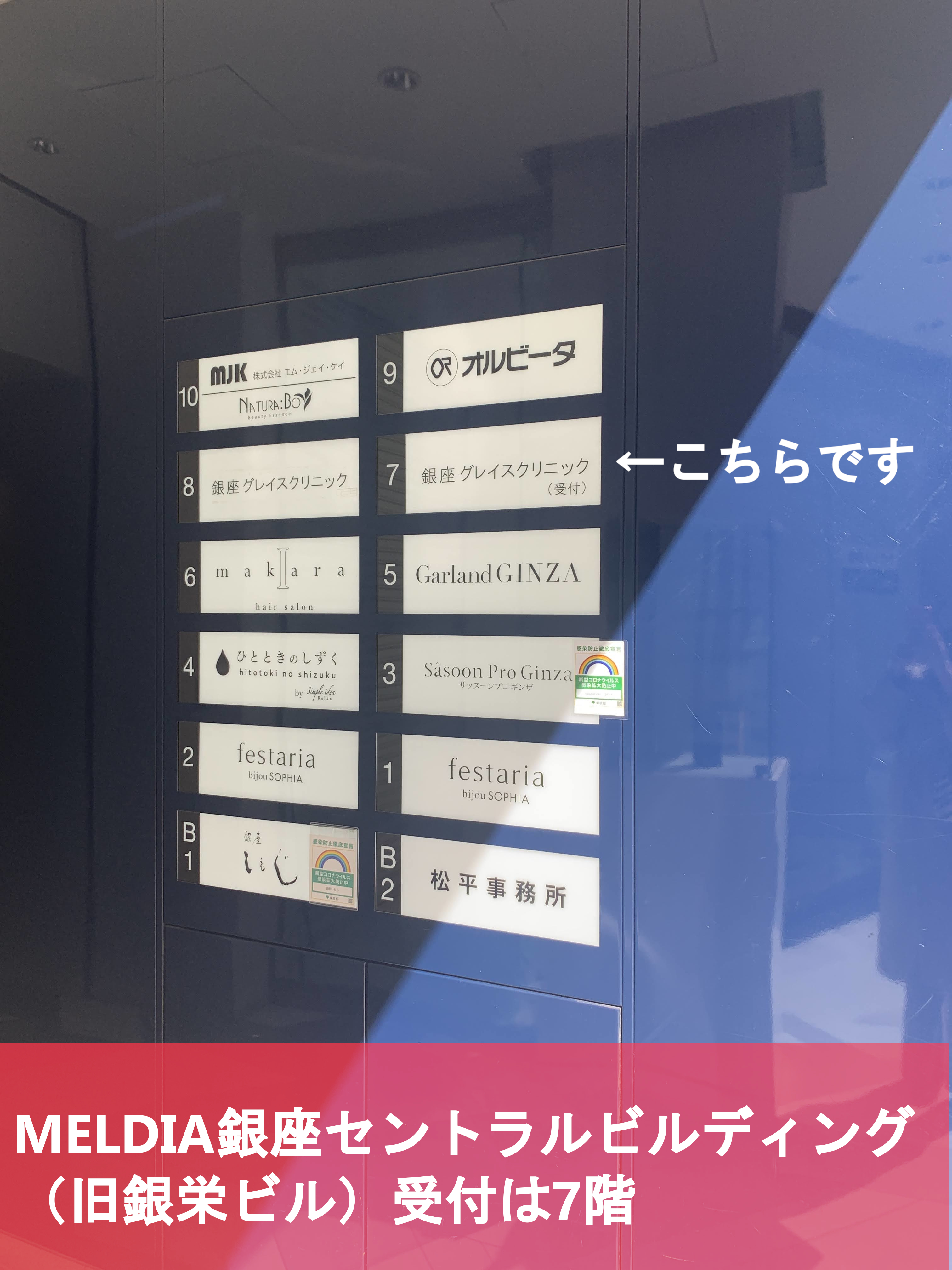 地下鉄銀座駅A2出口から徒歩5分、新橋駅銀座口から徒歩5分と好立地です。銀座通りに面したMEDIA GINZA ENTRAL BUILDINGS(旧銀栄ビル)の7階が受付になります。